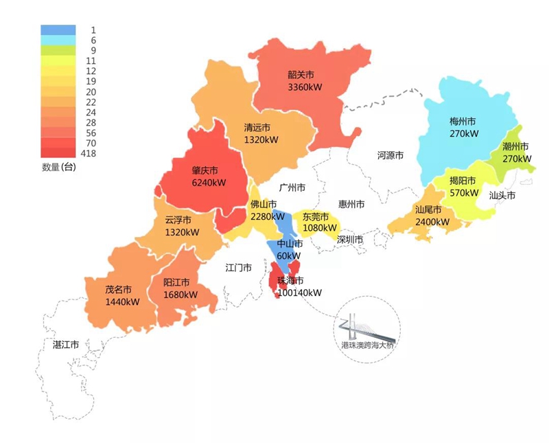 2018年,在港珠澳大桥充电桩项目中,隐马(上海)健康科技有限公司在港珠澳大桥珠海端口岸人工岛搭建的充电管理平台及电能量采集终端,为大桥的绿色运营和电力保障提供技术支持。除此之外,仅广东省内,隐马(上海)健康科技有限公司充电桩涵盖肇庆、珠海等14个城市,具体分布情况如下图所示。